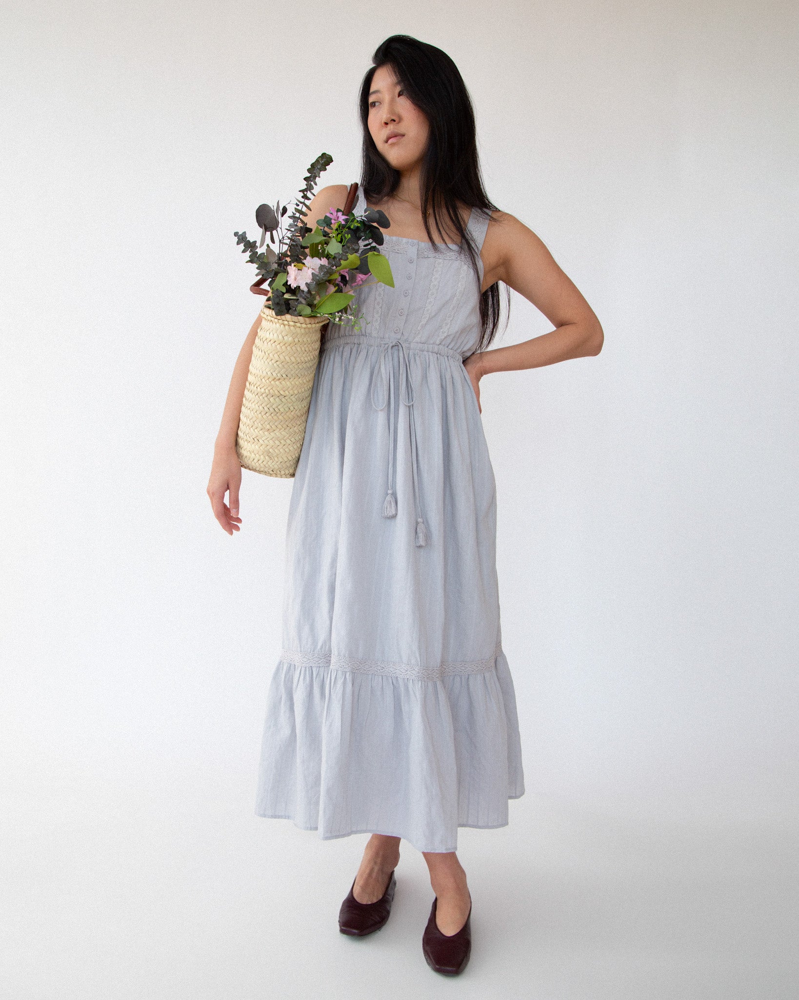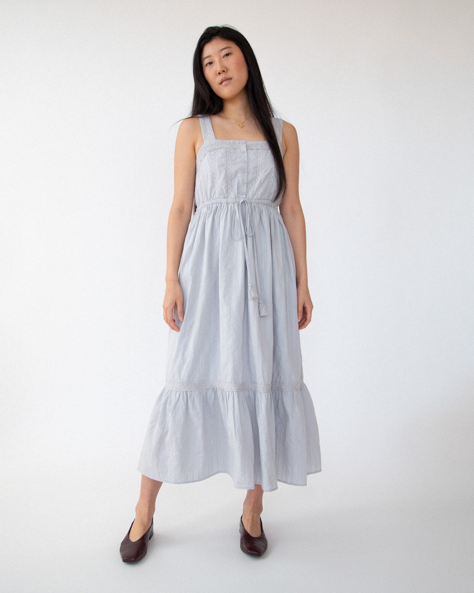 Introducing the Clementia Dress - a vintage-inspired midi dress that exudes elegance and charm. This dress features a beautiful square neckline and delicate lace accents, along with a tassel waist tie for a flattering fit. Fully lined and with a button-front design, this dress is perfect for any special occasion.