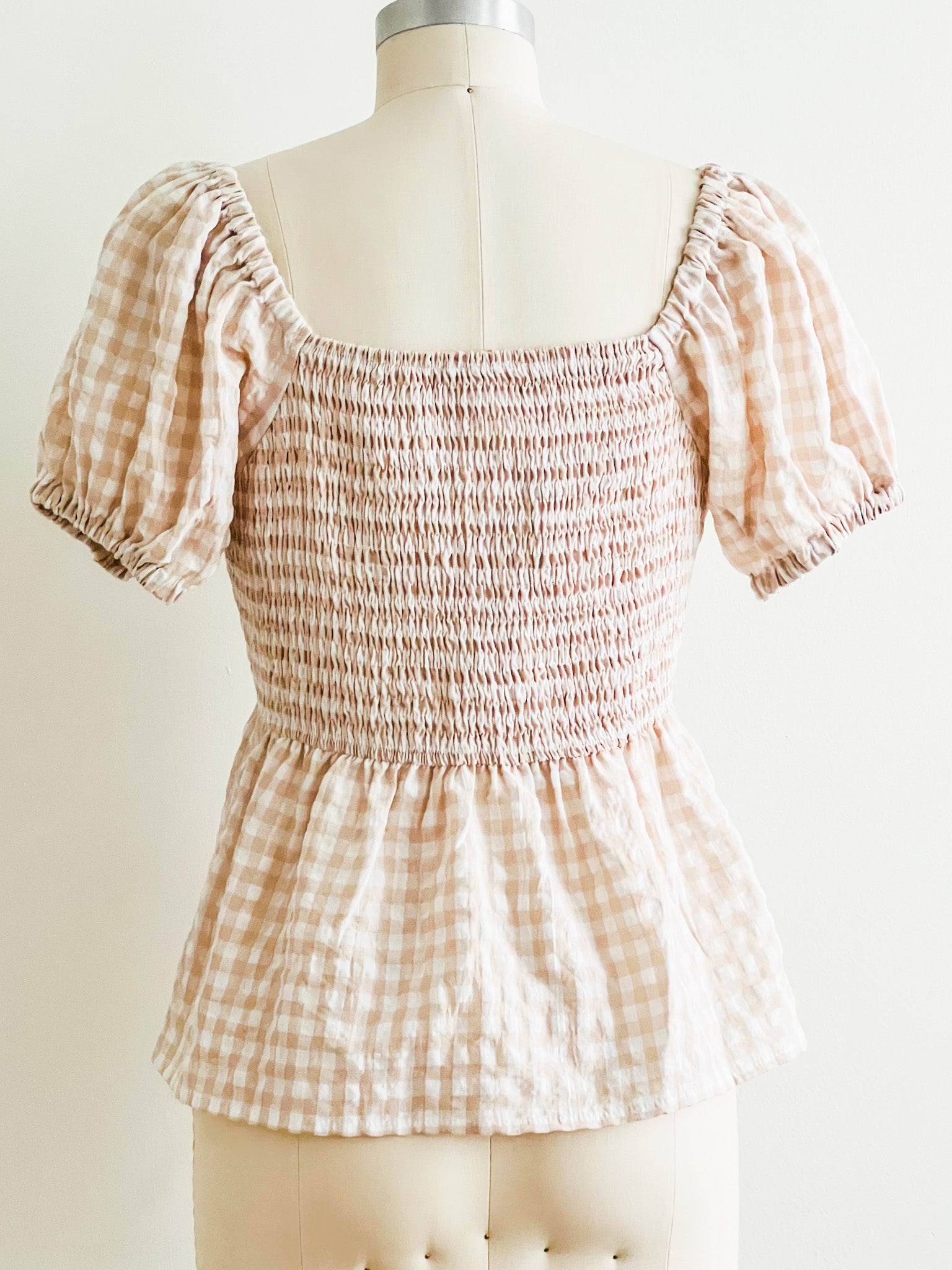 This babydoll top comes in a gingham pattern. It has a smocked back, lined bust, and hook and eye front fastening.