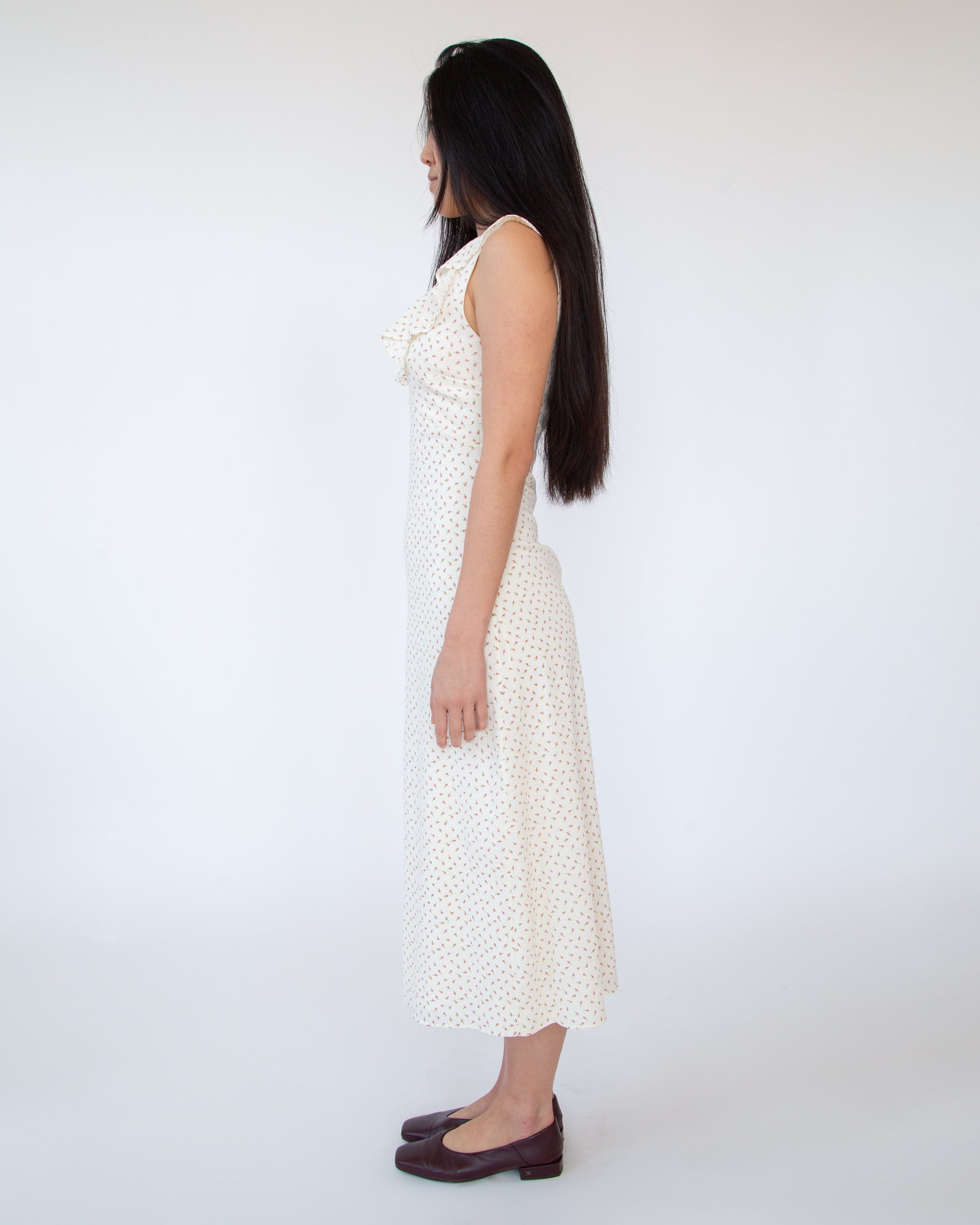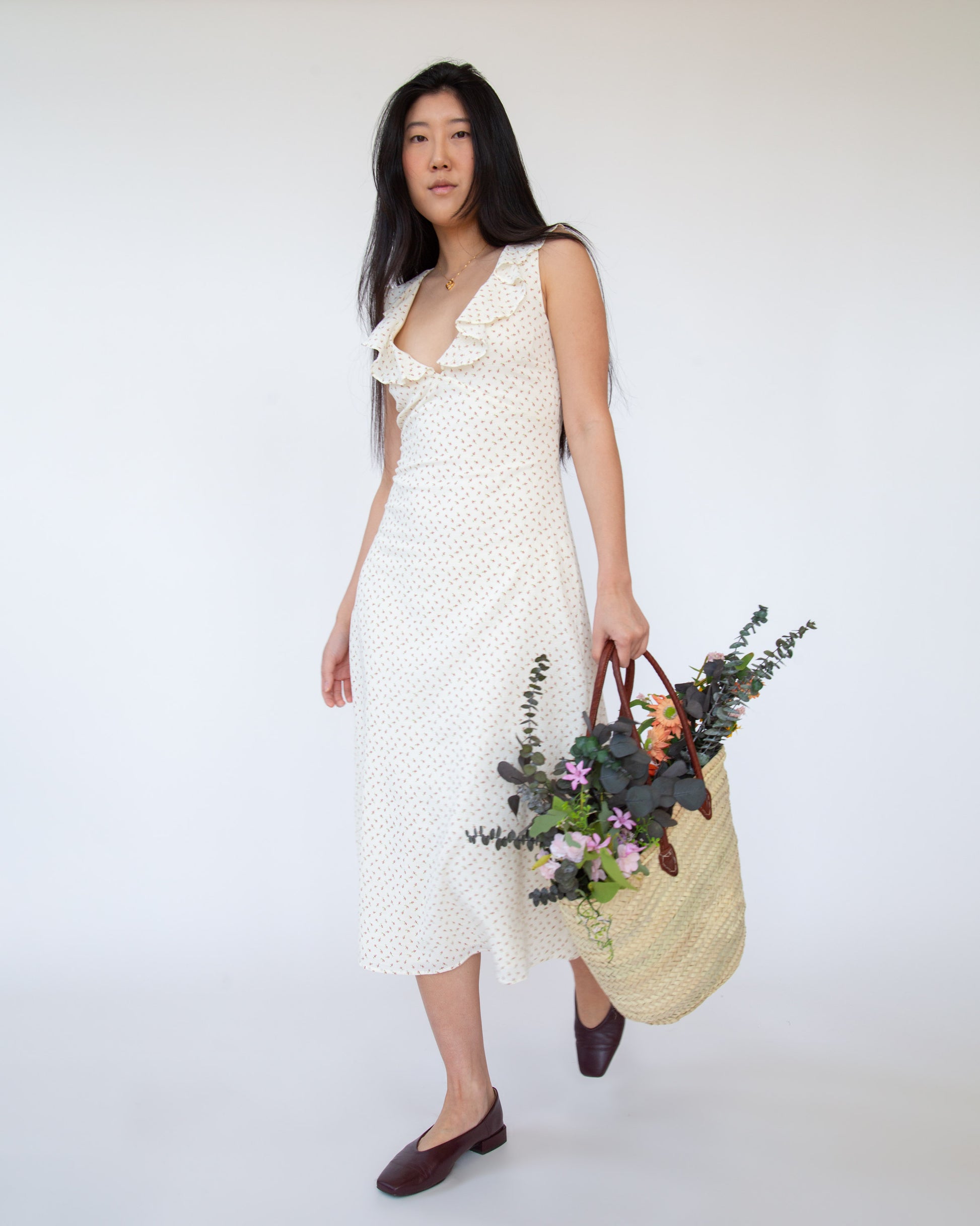 Embrace your feminine side with our Fleuri Dress. The ditsy floral print and ruffled v-neckline create a soft and romantic look. This midi dress will add a touch of elegance to any occasion.
