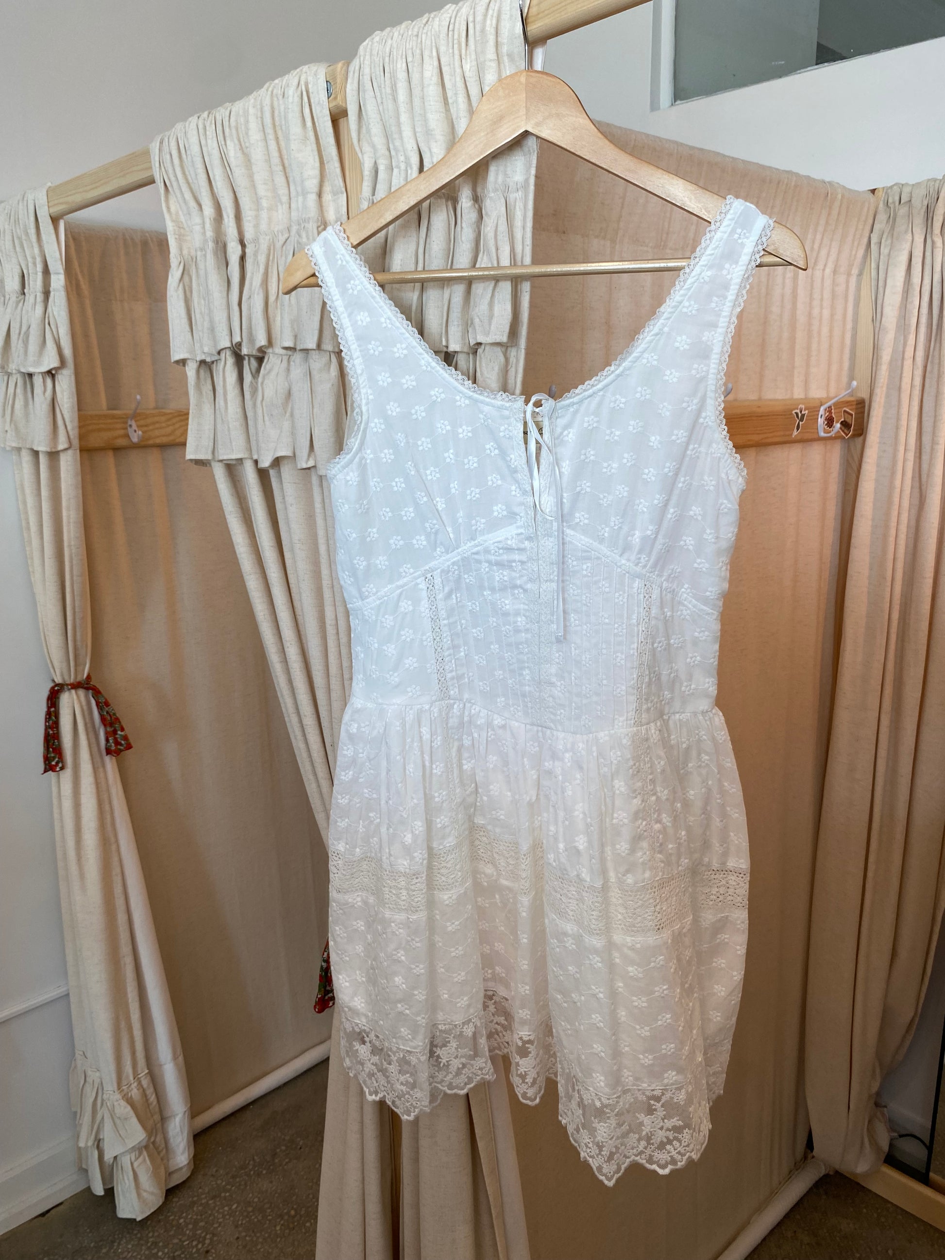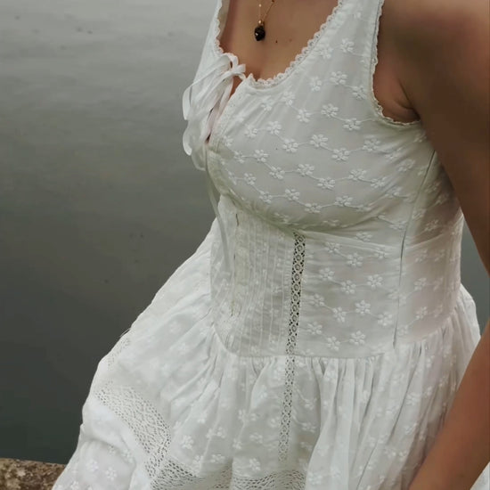The Mona Dress is crafted from 100% cotton, featuring a delicate floral eyelet print that feels light and breathable. Designed sleeveless with soft lace detailing on the front and a charming tie closure, this mini dress offers a gentle, feminine look perfect for warm, sunny days.
